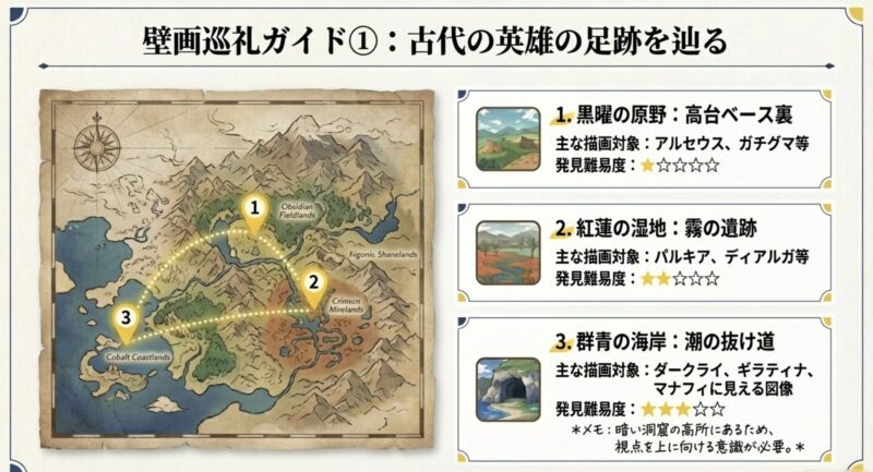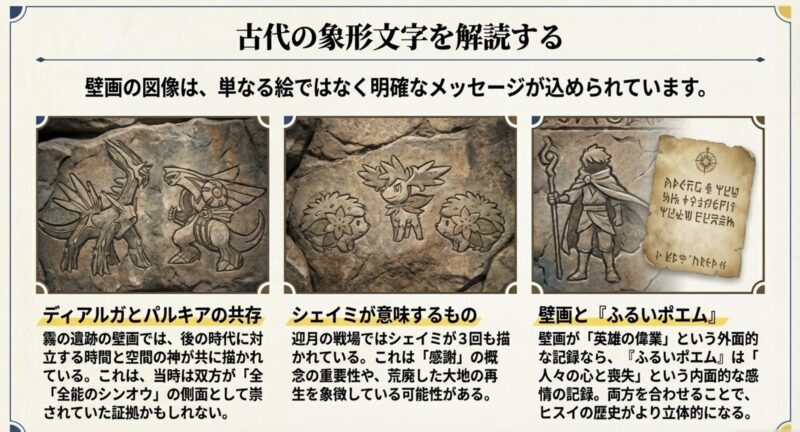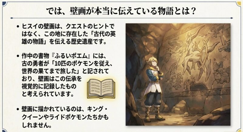 ヒスイ地方に点在する壁画は、単なる背景美術ではなく、「人とポケモンの共存の歴史」や「古代の英雄の伝説」を物語る、世界観の核心に触れる重要なピースです。