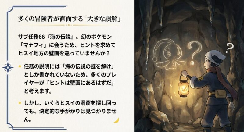 しかし、任務の説明文を見ても「海の伝説の謎を解け」としか書かれておらず、ヒスイ地方中を探し回っても具体的なヒントが見つからない……という状況に陥りやすいんですよね。