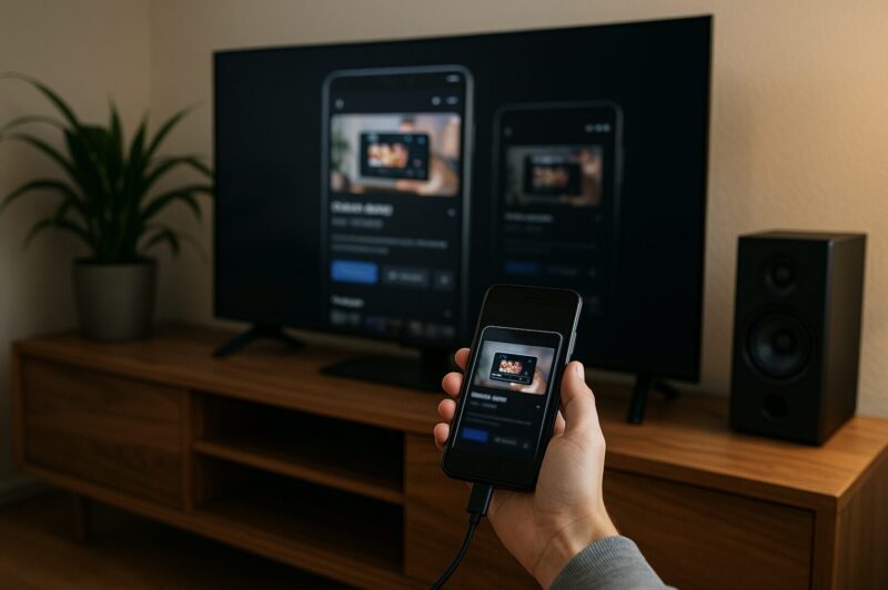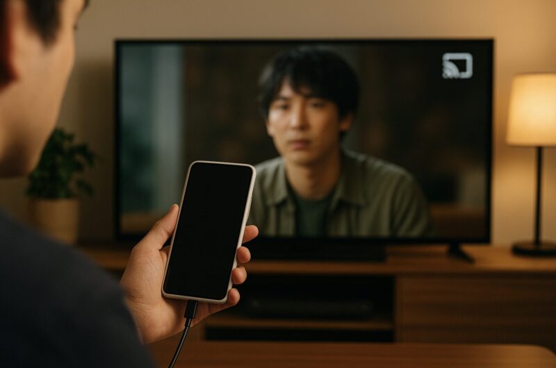 iPhone用のLightning-HDMI変換や、Android用のUSB-C-HDMI変換を使います。費用は5,000〜10,000円前後(一般的な目安)。
