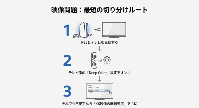 最短の切り分け:まずPS5→テレビへ直結(途中機器なし)にして、4K120Hzが安定するか確認。安定したら途中機器(AVアンプ等)がボトルネックの可能性が高いです。
