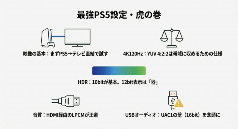ps5のビット数は「一発で何ビット!」じゃなくて、映像ならHDMI2.1の帯域幅と色深度、音なら出力ルートで決まる、というのが本質です。