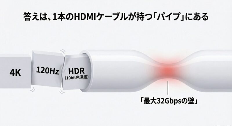 解像度(4K)とリフレッシュレート(120Hz)が上がるほど、必要なデータ量は爆増します。