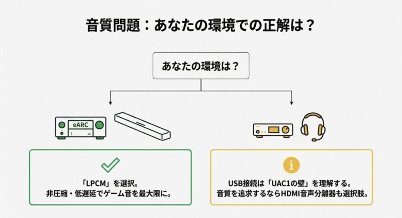 さらに音も、LPCMの24bit/48kHzやeARCの7.1chは強いのに、USB DACはUAC1の壁で16bitになりがち……みたいな「え、そこ制限あるの?」が混ざってきます。