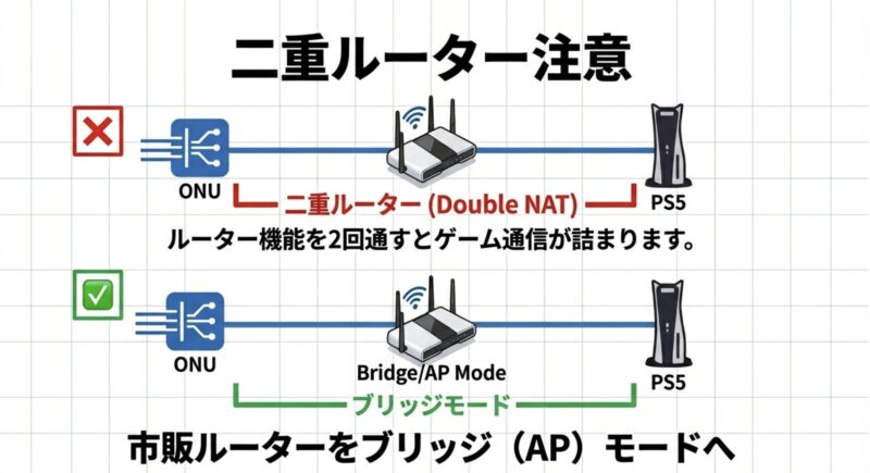 この状態でさらに市販ルーターをルーターモードにすると二重NATになりやすいので、PS5側は有線でも通信が詰まることがあるんですよね。