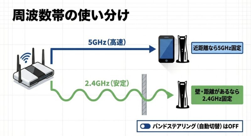 無線しか無理なら、周波数帯固定と置き場所の見直し。