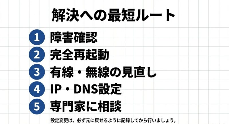 まずは状況確認→軽い再起動→それでもダメなら切り分け、の順が安全です。