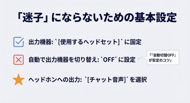 - 最優先が手軽さ:設定だけでまず分ける(チャット音声+出力先固定)