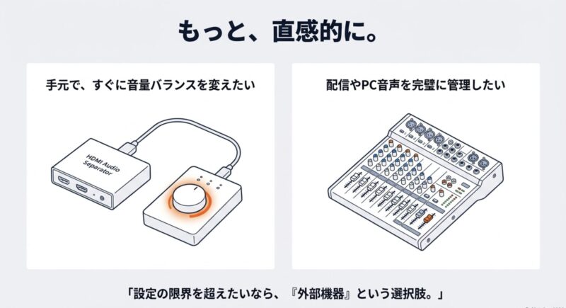 「手元でゲーム/VCのバランスを物理ノブで触りたい」なら、定番はHDMIからゲーム音を分離して、USBでチャット音を受ける構成です。