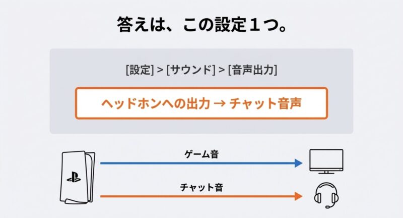 ヘッドホンへの出力を「チャット音声」にすると、PS5は「チャット音はヘッドホン(USBやコントローラー)、ゲーム音はHDMI(テレビ/モニター)」みたいに分ける挙動になります。