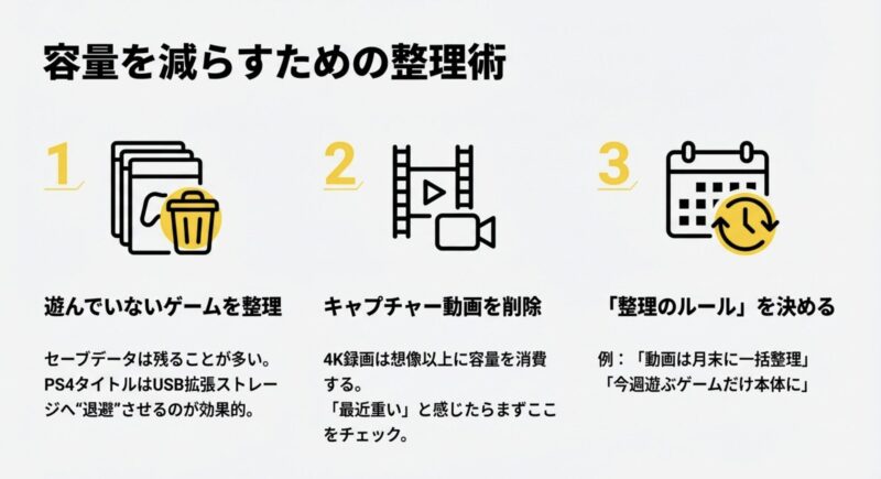 あとは、定期的にキャプチャーや遊ばないゲームを整理して“詰まらない運用”にするだけで、ストレスがかなり減ります。