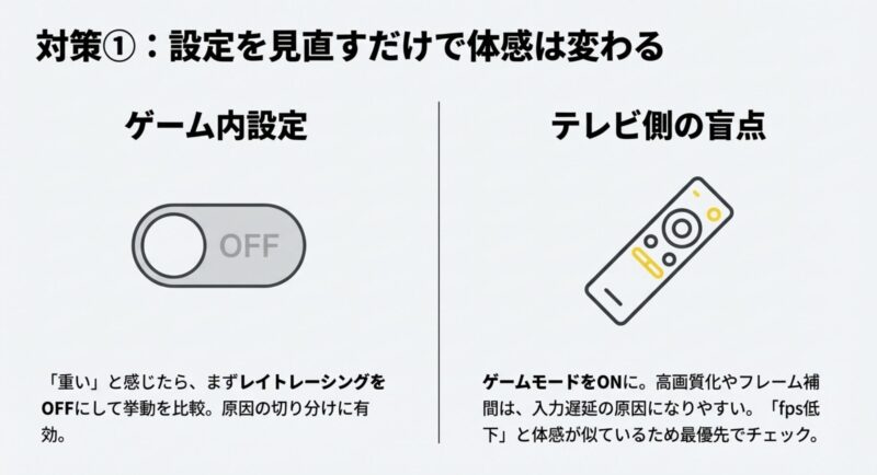 入力遅延は“fps低下”と体感が似ているので、テレビ側の設定も疑ってOKです。