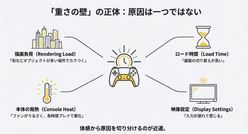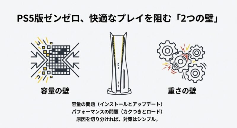 PS5でゼンゼロが容量的にキツい、重い気がする…という悩みは、ほとんどが「空き容量の余裕」「アップデートの増加」「負荷が高いシーン」「発熱や表示設定」「連携と通信」のどれかに整理できます。
