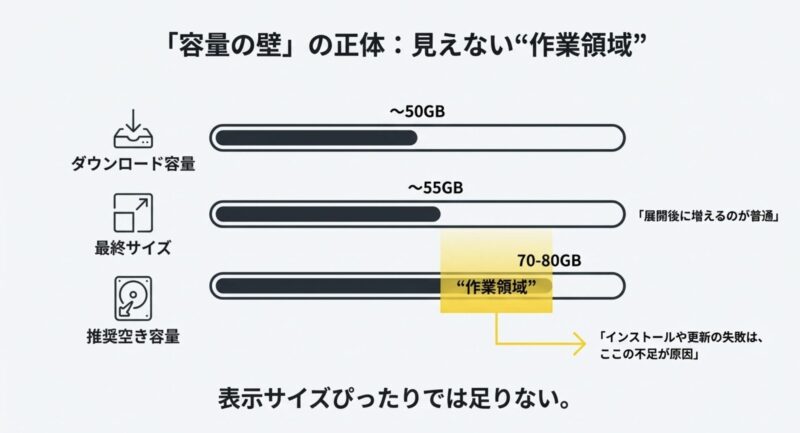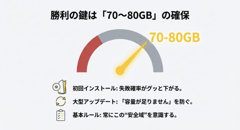 目安としては、最終容量55GB前後に対して70〜80GBくらい空けておくと、インストール失敗や更新エラーの確率がグッと下がります。