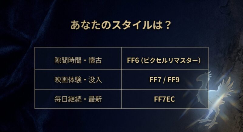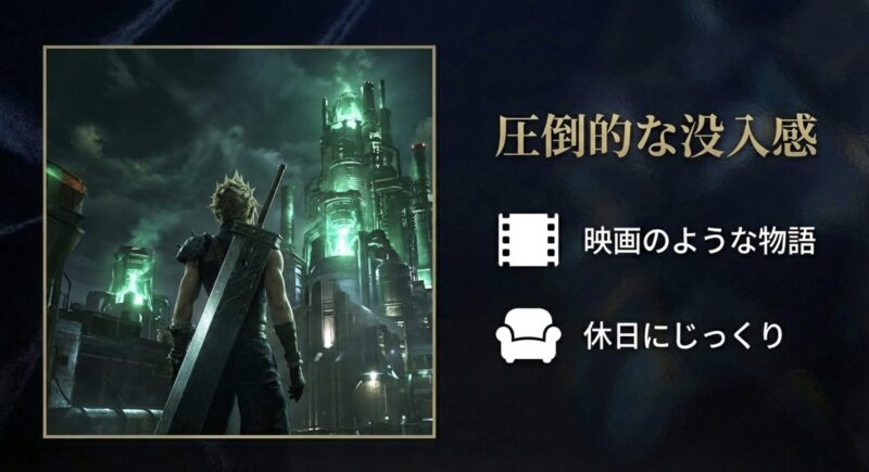 | FF7〜9 (3D移植) | じっくり・没入 | 40〜60時間 | 【休日集中型】 映画を見るような感覚。イベントシーンが長いため、まとまった時間が取れる時に遊ぶのがおすすめ。 |