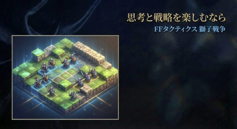 | FFタクティクス | 思考・やり込み | 50時間〜∞ | 【寝る前の一戦】 1マップの攻略に30分以上かかることも。じっくり思考に没頭したい夜長に最適。 |
