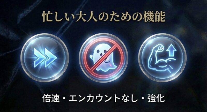 - 高速モード(3倍速など):移動やバトルの速度を劇的に速くします。広大なフィールドの移動や、単調なレベル上げ作業が爆速で終わります。