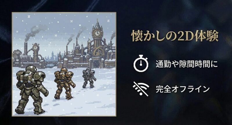 | FF1〜6 (ピクセルリマスター) | サクサク・短時間 | 15〜40時間 | 【通勤派に最適】 オートバトルとどこでもセーブ機能により、5分の隙間時間でも進行可能。FF1なら10時間台でクリアも。 |