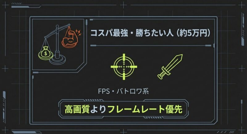 RPGやMMOなど、グラフィックの美しさを楽しみつつ、滑らかな動きも欲しいというバランス型の人に向いています。