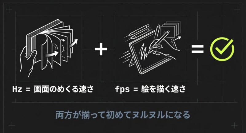 まず、リフレッシュレート(Hz)は画面側の基礎体力のことです。