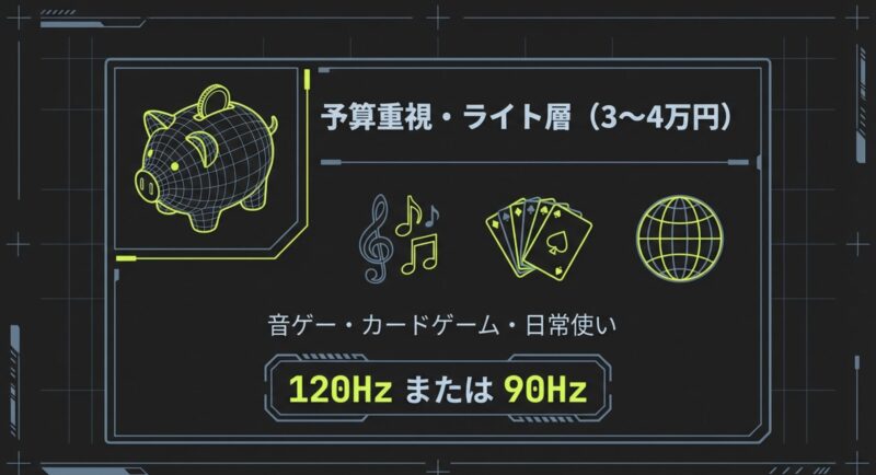 でも安心してください。用途を絞れば、3万円台〜4万円台のエントリー〜ミドルレンジ帯でも、120Hzのヌルヌル感を体験することは十分に可能です。