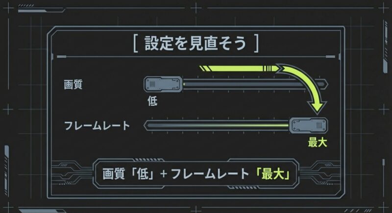 滑らかさを最優先するなら、画質はあえて低または標準に落とし、フレームレート設定のみを最大にするのがゲーマーの定石です。