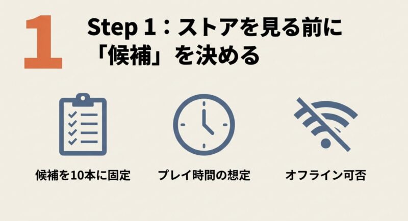 小技:候補を決めるときは「今月はRPG」「今月はオフライン中心」みたいに、テーマを1個だけ決めると選びやすいです。