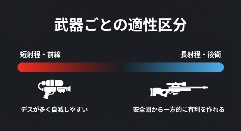 相性がいいのは、長射程や中後衛寄りで、安全圏からキルを取りやすい武器です。