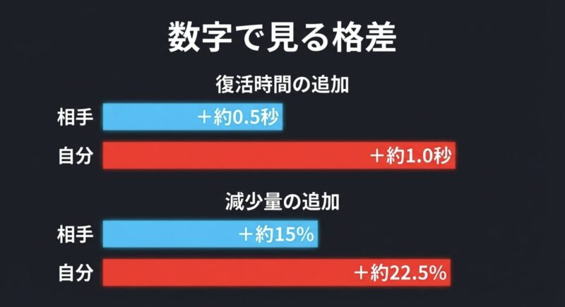 数字は検証ベースの一般的な目安ですが、相手には復活時間が約0.5秒、スペシャル減少量が約15%追加、自分には復活時間が約1.0秒、スペシャル減少量が約22.5%追加でかかる、と考えるとイメージしやすいです。