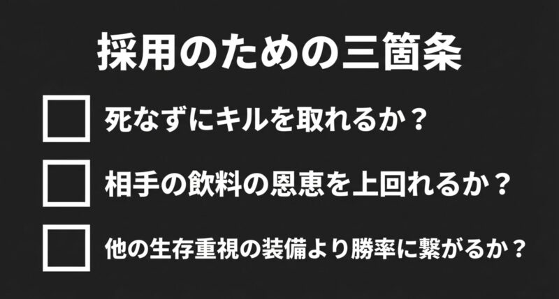 みんなが付けているからやキル武器だからで採用すると失敗しやすいです。