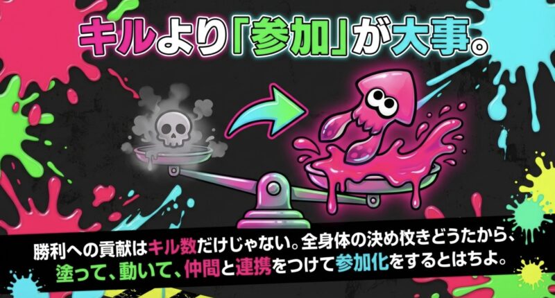 具体的には、味方の近くで塗ってルートを作る、オブジェクトの近くにいる、デスしても前線復帰が早い、こういう「参加してる感」を作っていく感じですね。