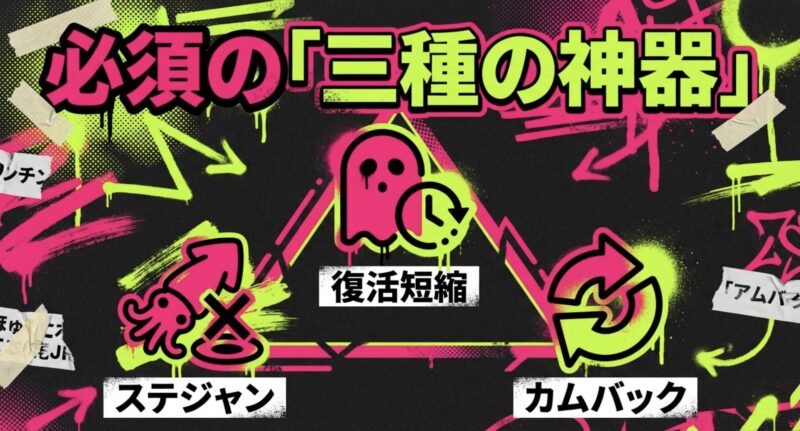 - 復帰直後のバフ(カムバック等)で盤面を押し返す