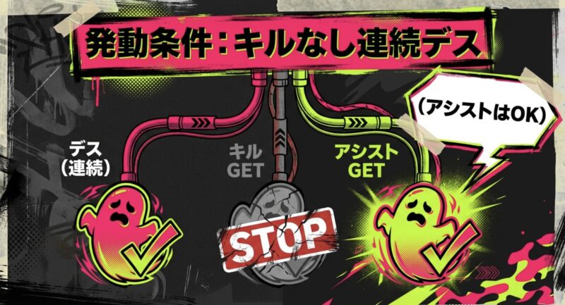実際はキルを挟んでない連続デスが大事で、キルが挟まるとリセットされる。