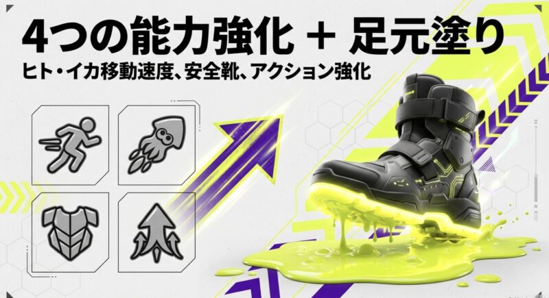 付与されるのは、ヒト移動速度アップ、イカダッシュ速度アップ、相手インク影響軽減、アクション強化の4つ。