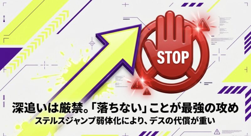 ステルスジャンプが重くなると、前線復帰のテンポが落ちるので、無理デスが前より痛いです。
