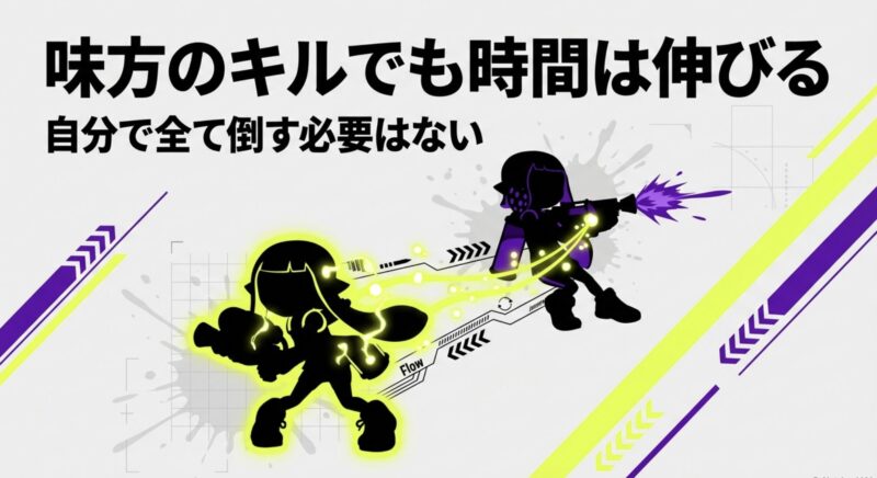 延長の仕組みも重要で、イカフロー状態中に相手を倒す、または自分がダメージを与えた相手を味方が倒す(アシスト扱い)と、継続時間が少し伸びます。