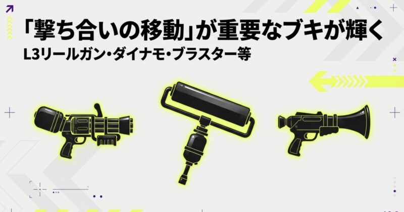 | L3リールガン | 撃ち合い・射撃の通しやすさ | ヒト移動速度アップで対面が伸びやすい | 塗りが落ちるなら立ち回り要調整 |