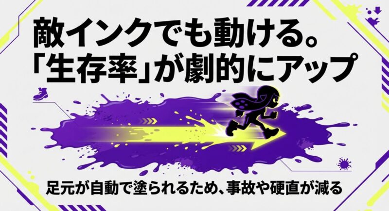 これがあると、敵インクの上での事故(足取られ・スリップダメ・硬直)を減らしやすいんですよね。